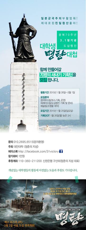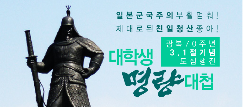 일본의 군국주의 부활 멈춰! 제대로된 친일청산 좋아! 광복 70주년 3.1절 기념 도심 행진! <대학생 명량대첩>을 준비하는 대학생들을 후원해주세요.