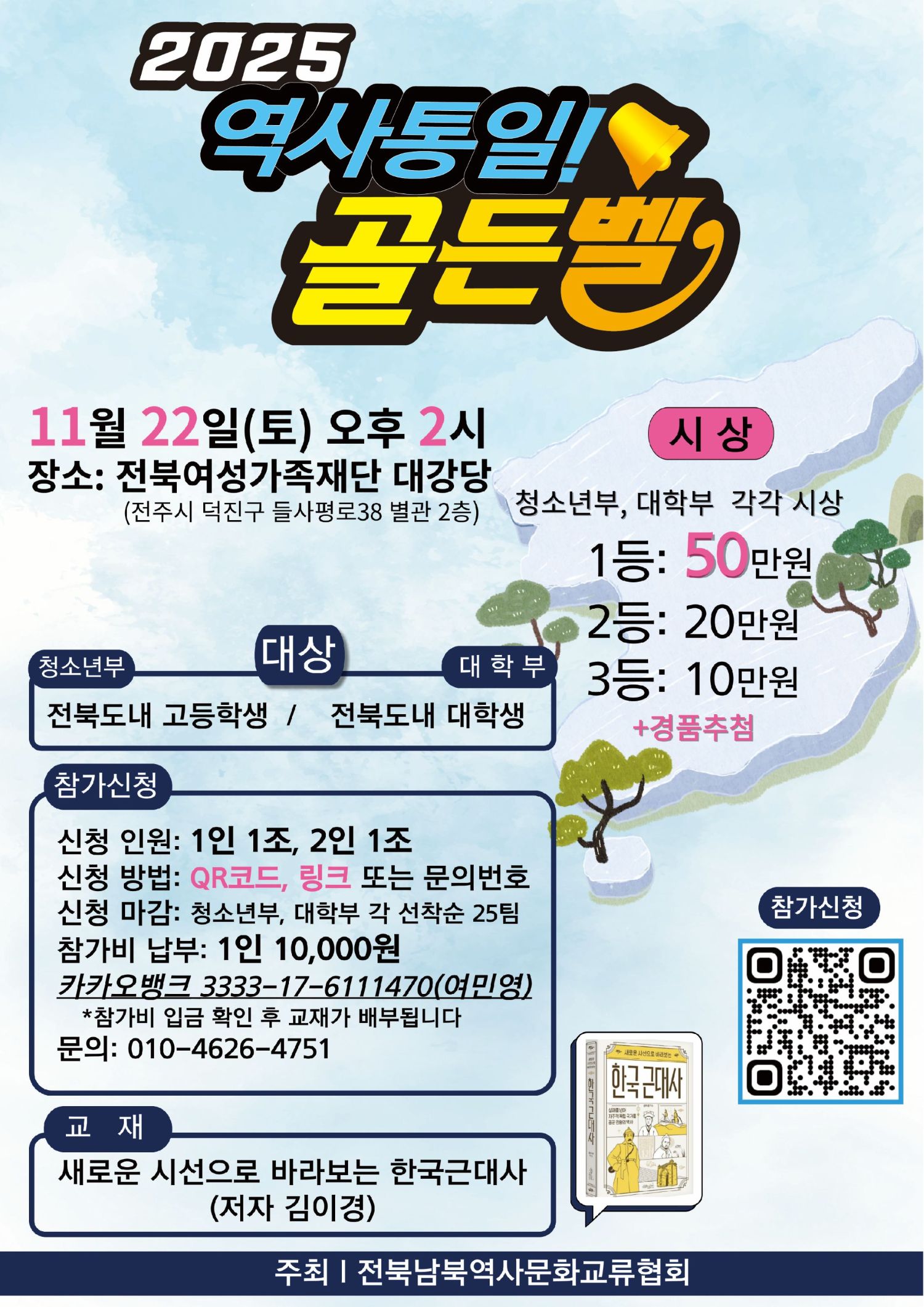 2025년 올해는 광복 80주년을 맞이하는 역사적인 해입니다. 일제 강점기와 광복에 대해 제대로 이해하기 위해서 근대사는 매우 중요한 시기의 역사입니다. 역사통일골든벨은 일제 강점기 직전인 우리 근대사를 공부하고 북에서 바라보는 관점의 차이와 같음을 알아볼 수 있는 뜻깊은 자리가 될 것입니다.
