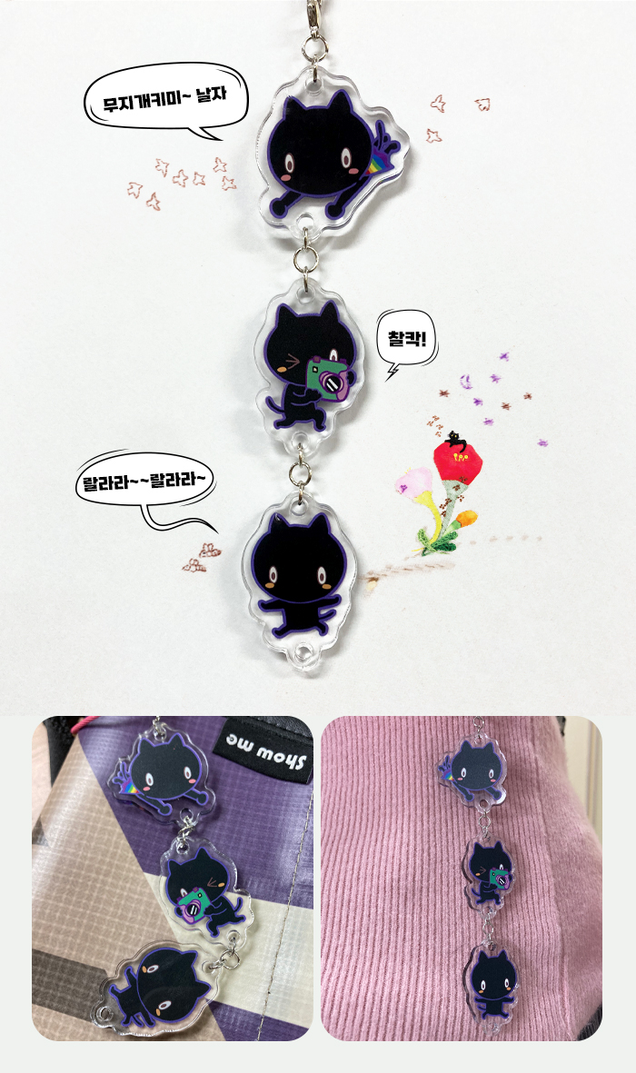 투명아크릴 재질의 키미가 3단으로 연결되어 있습니다. 각각의 키미는 길이 3cm로 원하는대로 재연결해서 나만의 키링으로 만들 수 있습니다.