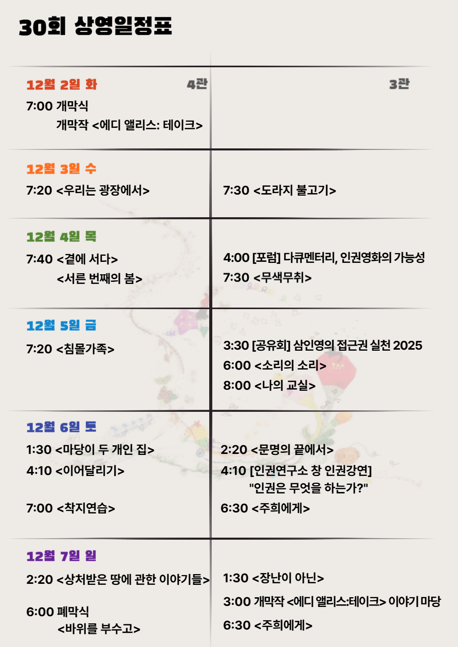 🎬인권영화제를 애정하는 이들에게 기대어 30회 인천인권영화제의 스크린을 펼치려 합니다. 30주년을 맞이하는 인천인권영화제와 함께 축하와 연대의 마음을 나눠주세요.