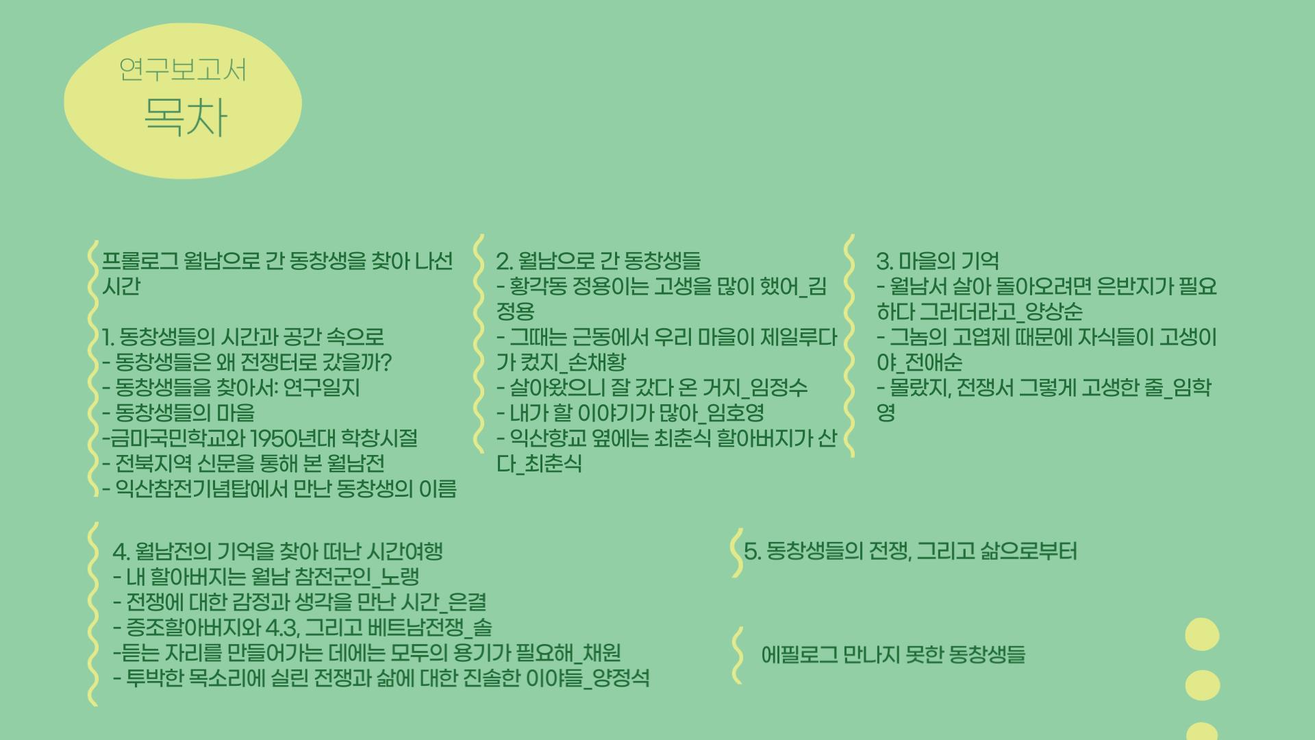 연구 보고서 목차 중 '월남으로 간 동창생들'과 '마을의 기억'은 각각 참전군인과 가족, 이웃의 인터뷰로 구성되어 있어요.