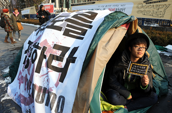 <아프니까 점령이다! 'Occupy여의도'>의 점령지인 한국거래소 측은 어떠한 전기도 제공하지 않고 있습니다. 구청과 경찰은 4차례 철거를 진행하였고, 경찰들은 바람을 막을 비닐마저 덮지 못하게 해 노숙을 진행하고 있습니다. 어쩔 수 없이 발전기를 가동하고 있는데 밤에만 돌리는데도, 이틀동안 4만5천원의 기름값이 들어갑니다.