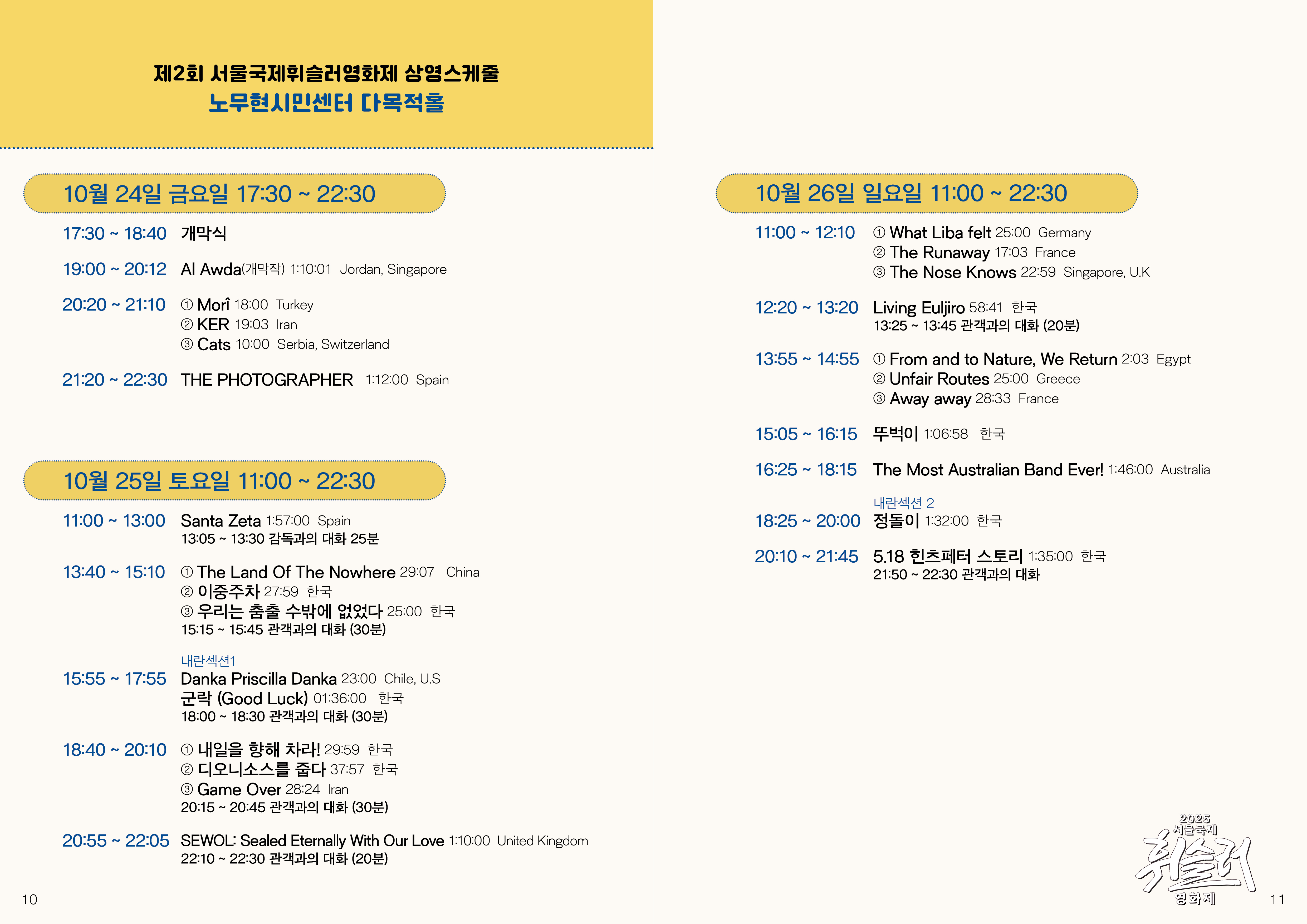 한국, 프랑스, 세르비아, 스위스, 튀르키에, 이란, 그리스, 중국, 독일, 칠레, 미국, 스페인, 이집트, 요르단, 싱가포르, 영국, 호주에서 온 영화들—각각의 나라, 각각의 목소리가 이 영화제를 통해 세상에 울려 퍼졌습니다.
